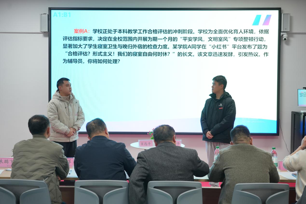 案例研讨环节以“我提问,你回答”的创新形式开展,参赛选手通过赛前抽签确定分组与案例,围绕学生管理中的典型问题共同辨析原因、研讨对策。选手们思路清晰、言之有据,充分展现了分析问题、研判问题、解决问题的专业能力,评委现场提问环节更凸显了临场应变与深度思考能力。