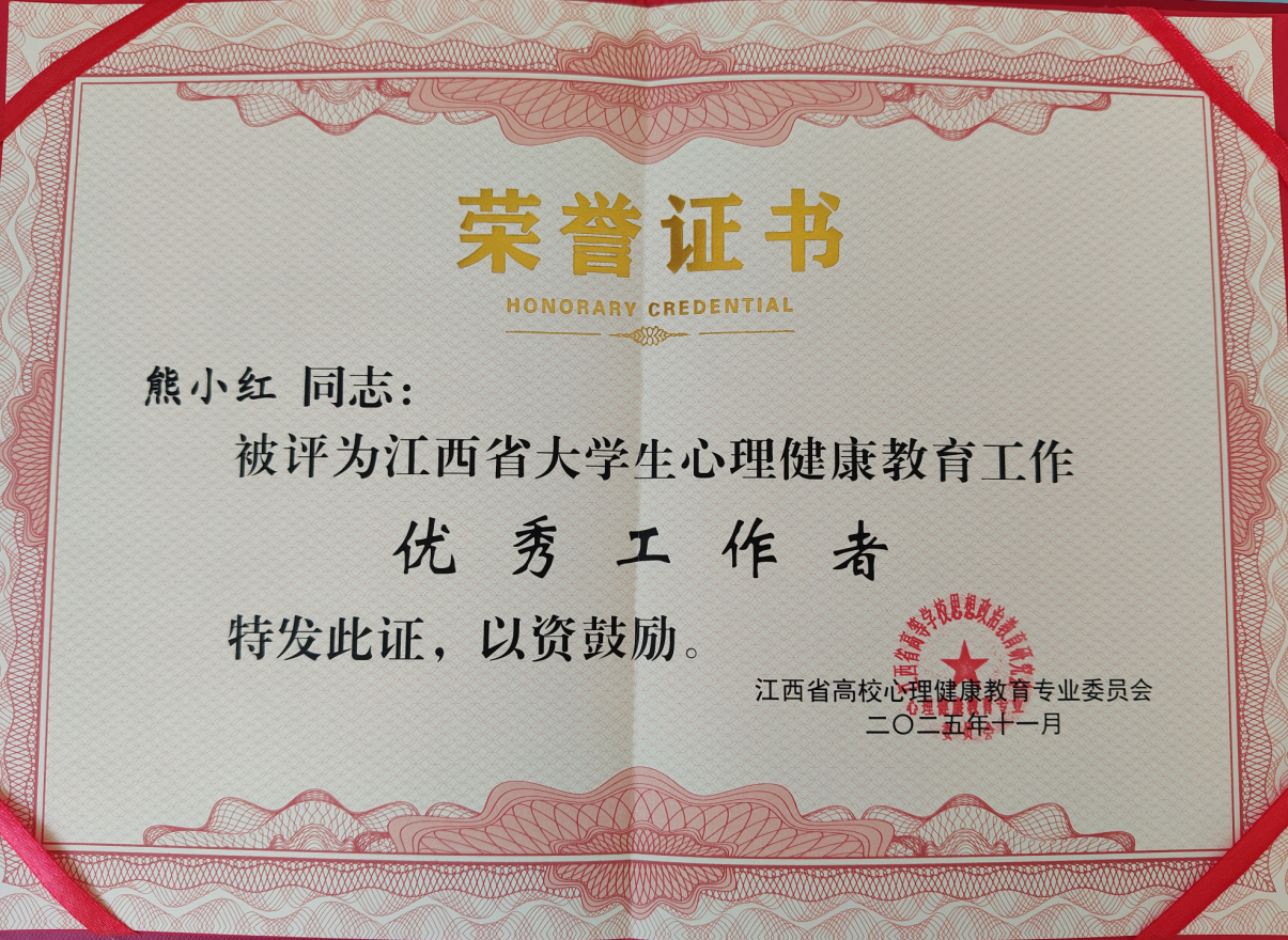 熊小红老师凭借其在心理健康教育工作中的出色表现,被评为江西省大学生心理健康教育工作“优秀工作者”。熊小红老师长期投身于心理健康教育工作,以高度的责任心和敬业精神,时刻关注学生的心理动态,积极开展各种心理健康教育活动,为学生提供了及时、有效的心理支持和引导,在校园内营造了关注心理健康、积极向上的良好氛围。